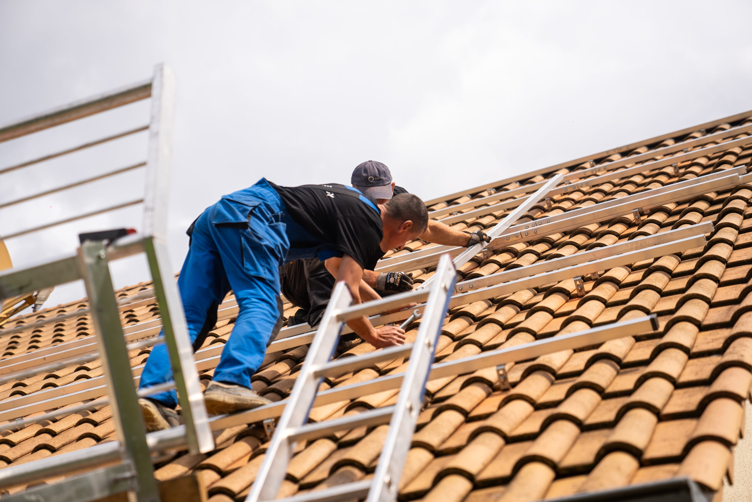 Montage der Unterkonstruktion passend zum Dachtyp (z. B. Dachhaken und Schienensystem auf Schrägdächern)